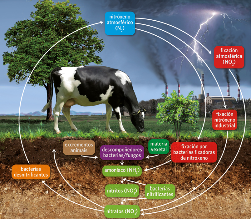 ), e estes, en nitratos, unha forma do nitróxeno xa utilizable polas plantas.