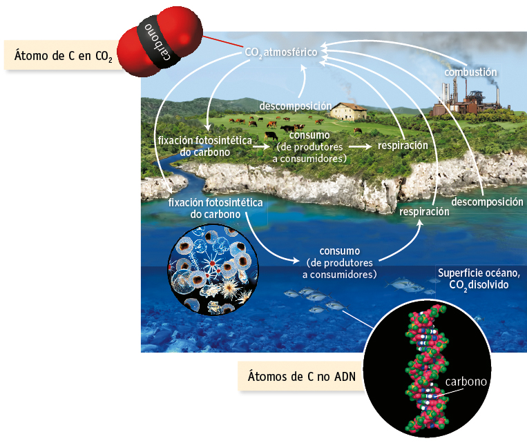 O carbono atópase en estado gasoso, como dióxido de carbono (CO2), na atmosfera, e disolvido na auga dos océanos. En ambos os dous casos é captado polos produtores, que o combinan co hidróxeno da auga e cos sales disolvidos para formar moléculas orgánicas durante a fotosíntese.