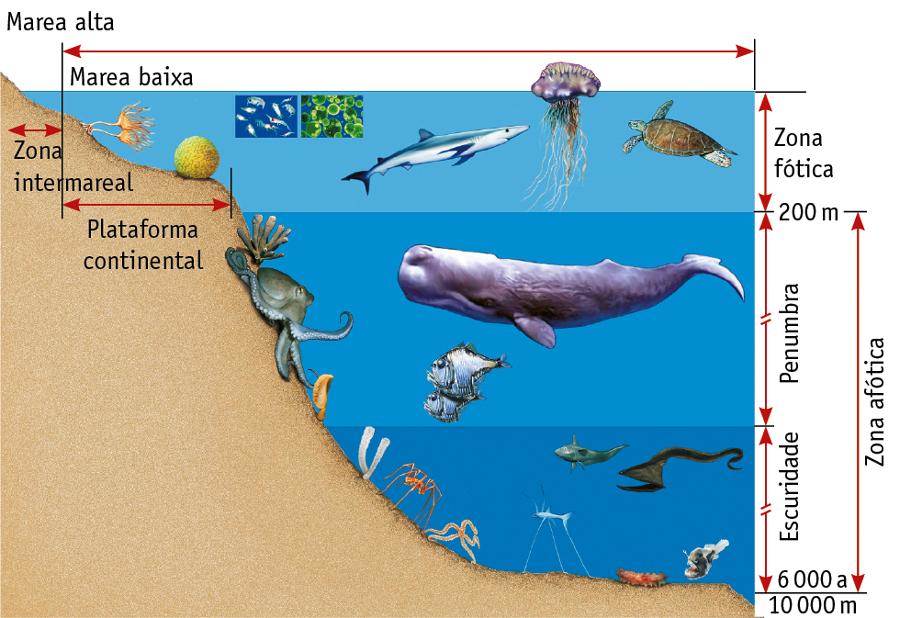 Nos mares e océanos distínguense a zona fótica ou iluminada, onde abundan os organismos fotosintetizadores, e a zona afótica, con ausencia total ou parcial de luz.